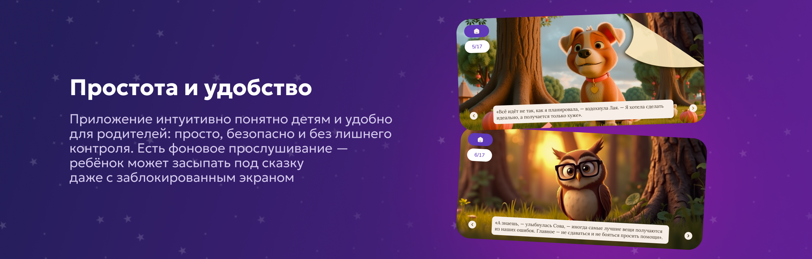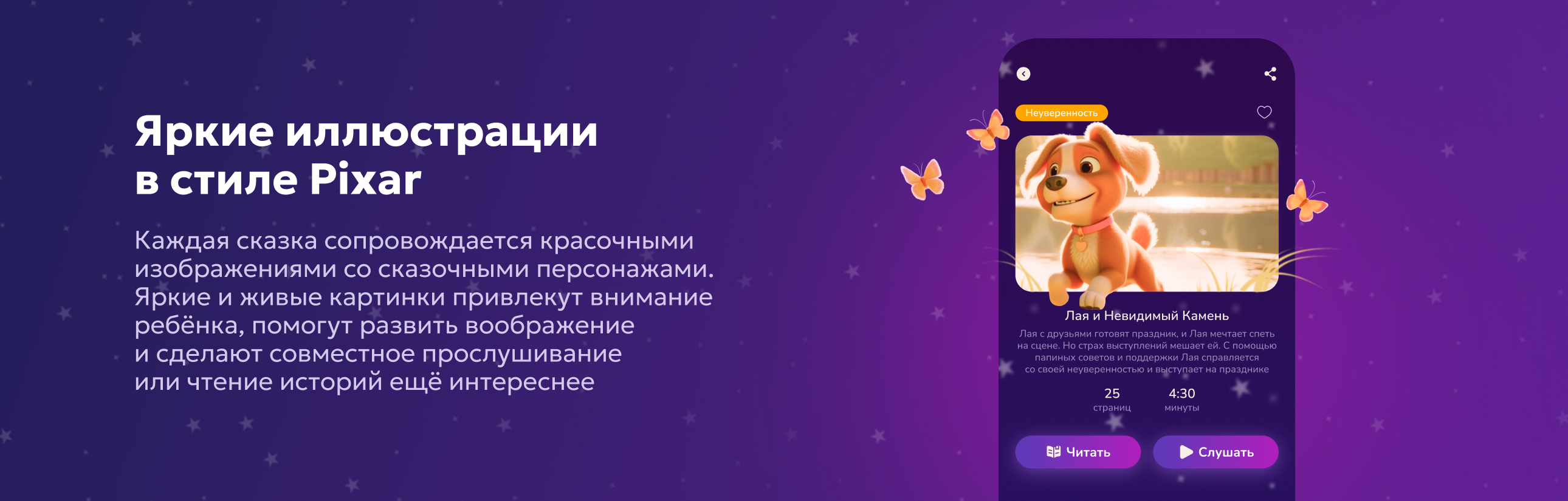 Искал сказку про собачку — увидел это приложение, скачал. Подкупила визуализация — лежишь с сыном, читаешь. Пробовал включить аудио, но сыну не зашло — нравится когда читает папа, видимо. На следующий день сын вспоминал Лаю, а значит, сказка оставила впечатление)