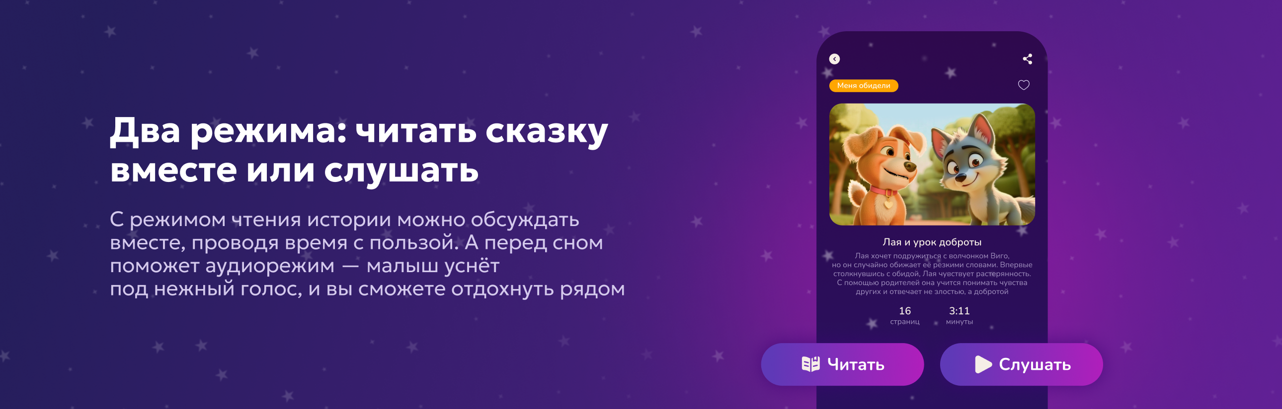 Библиотека пополняется новыми историями несколько раз в месяц, чтобы у ребёнка всегда было что‑то новое и интересное. Кроме того, автор может написать сказку по индивидуальному запросу родителя — с нужными темами или персонажами.